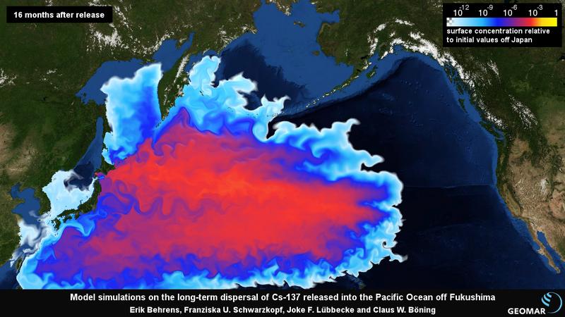 Simulierte Ausdehnung des kontaminierten Wasses im Sommer 2012, 16 Monate nach der Reaktorkatastrophe. Die Farben illustrieren die Verdünnung relativ zur ursprünglichen Ausgangskonzentration in den japanischen Küstengewässern: die höchsten Werte (rot gefärbt) betragen noch etwa ein Tausendstel der Werte im April 2011. Quelle: Grafik: GEOMAR (idw)