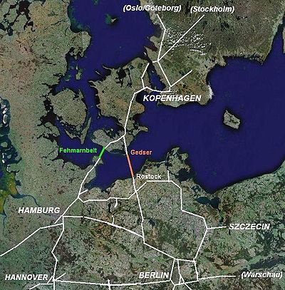 Die Feste Fehmarnbelt-Querung (grün) und die alternative Rostock-Gedser-Querung (orange). Bild: Casper / de.wikipedia.org