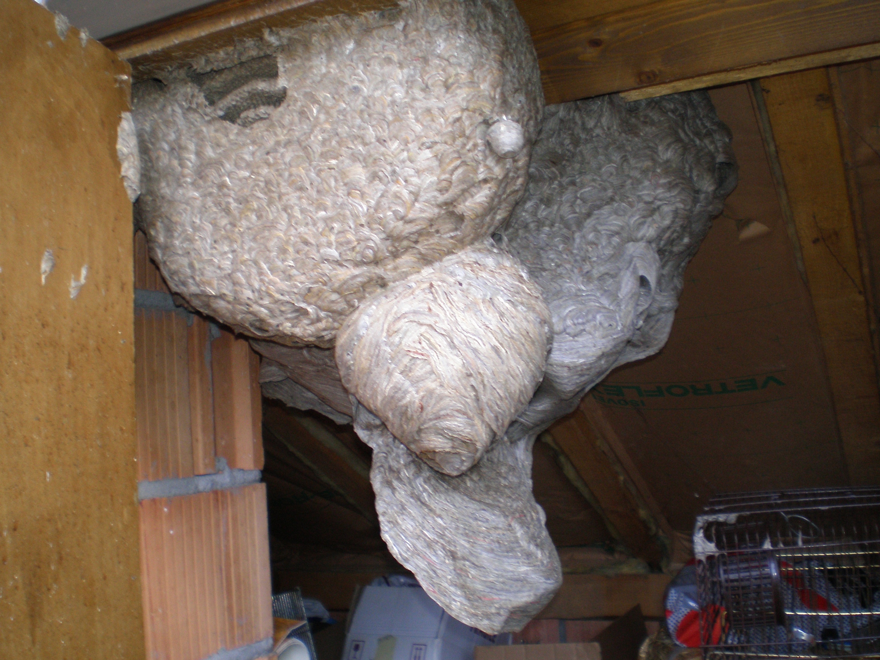Mehrere aneinander gebaute Nester der Gemeinen Wespe aus verschiedenen Jahren auf einem Dachboden