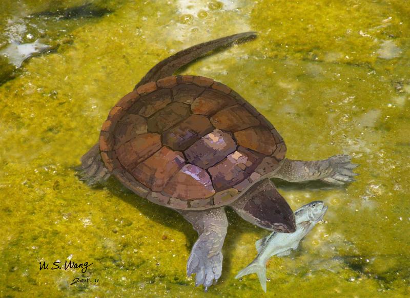 Lebendrekonstruktion der Schildkröte Xiaochelys ningchengensis im Süßwasser beim Erbeuten eines kleinen Fisches (Lycoptera), der in der gleichen Schicht gefunden wurde wie die Schildkröte. Quelle: Abbildung: W. S. Wang (idw)