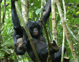 Bonobo-Weibchen mit Nachwuchs. Bonobos reagieren auf Signale schneller als Schimpansen. Quelle: C. Deimel (idw)