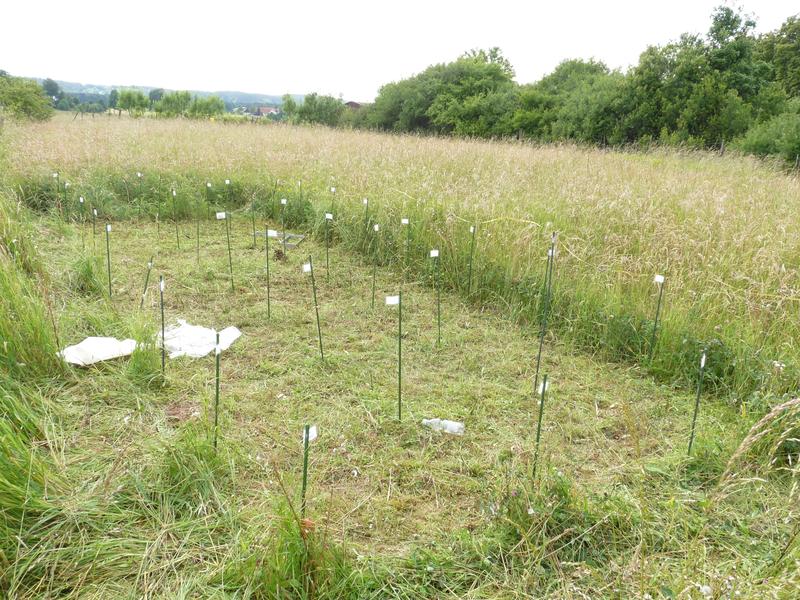 Untersuchungsfläche bei Bayreuth: Die Wiese weist eine hohe Artenvielfalt auf, während die Produktion von Biomasse ein mittleres Niveau erreicht. Ein Teil der Fläche ist bereits abgeerntet. Quelle: Foto: Reinhold Stahlmann, Universität Bayreuth; zur Veröffentlichung frei. (idw)