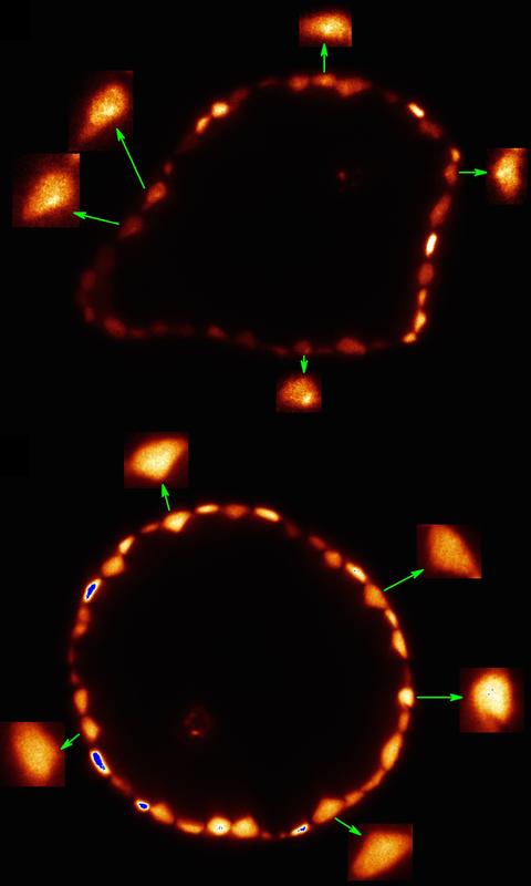 Arsenverteilung in der Blatthaut bei einer Konzentration von einem (oben) und fünf (unten) Mikromol Quelle: Mishra et al., Journal of Experimental Botany, DOI: 10.1093/jxb/erw238, CC-BY-3.0 ( (idw)