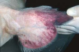 Petechiale Blutungen der Ohrmuschel bei einem an Afrikanischer Schweinepest erkrankten Tier