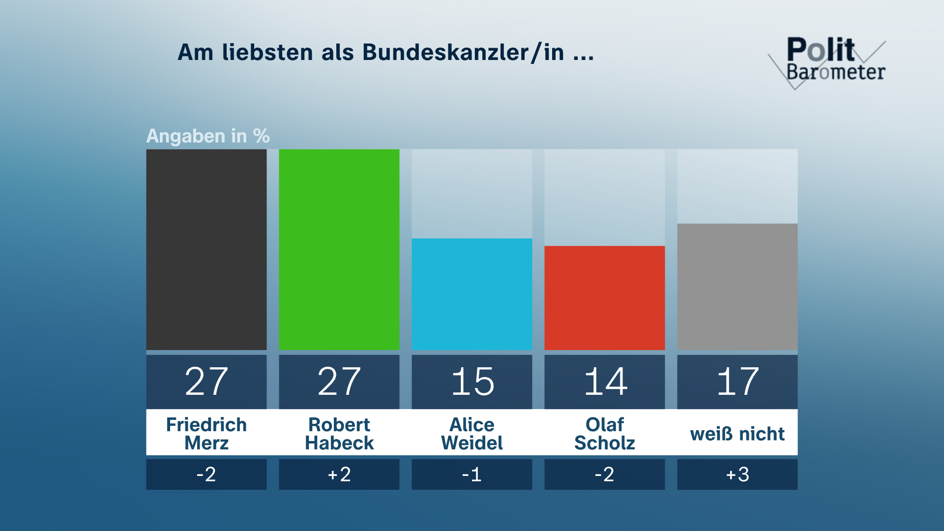 Zurück zu ZDF-Politbarometer Dezember II 2024 K-Frage: Merz und Habeck vor Scholz und Weidel