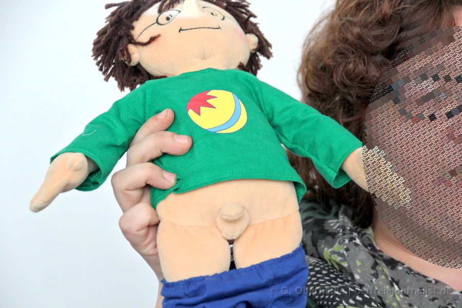 Kindergartenbox der BZgA: Wenn ‘Lutz’ dann nackt ist, können die Kinder – ganz der Intention der BZgA entsprechend – die Genitalien der Puppe ‘entdecken’, ‘schauen’ und auch ‘fühlen’, also anfassen! Passend spielbereit dabei ist dann auch die Puppenpartnerin ‘Linda’ mit ihrer Scheide, die während des Vortrags der BZgA allerdings noch nicht präsentiert werden konnte (aber in der frühkindlichen Sexualerziehungsbox auf jeden Fall mit enthalten sein soll).