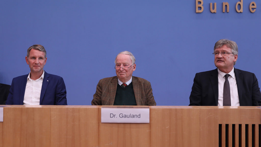Björn Höcke (li), Dr. Alexander Gauland (mi) und Prof. Dr. Jörg Meuthen (re) auf der Bundespressekonferenz zur Landtagswahl Thüringen am 28. Oktober 2019