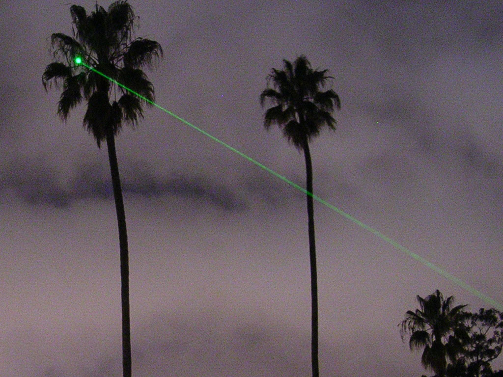 Der bei Nacht auf eine Palme gerichtete Strahl eines grünen 5-mW-Laserpointers.