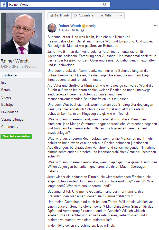 Facebook Kommentar von Rainer Wendt (CDU) von der Polizeigewerkschaft.