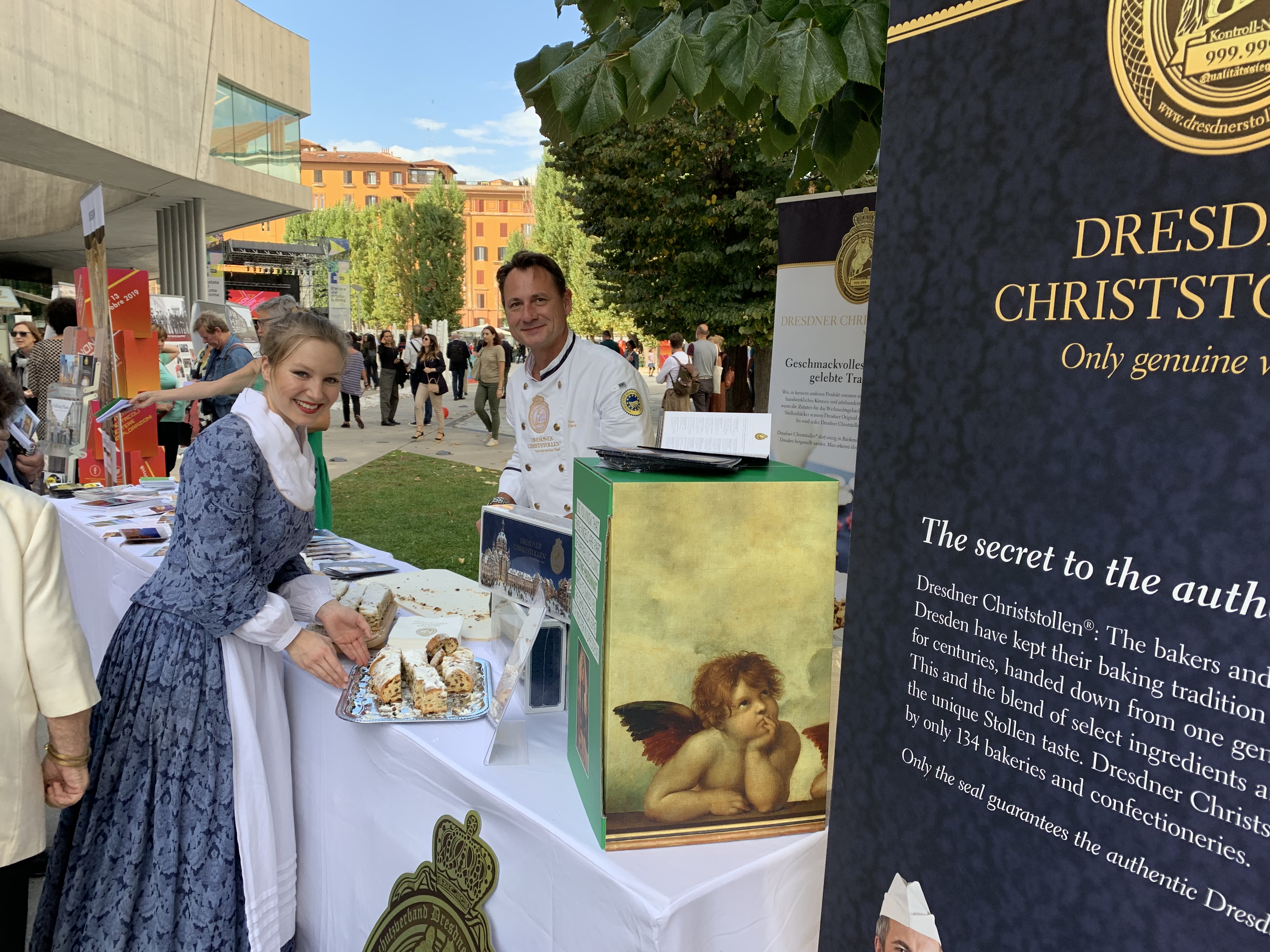 Das amtierende Dresdner Stollenmädchen Lina Trepte und der Bäckermeister Tino Gierig als sächsische Genussbotschafter in Rom. Bild: "obs/So geht sächsisch."