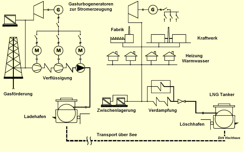 LNG-Gesamtsystem bestehend aus der Gasförderung, Verflüssigung, Be- und Entladung der LNG-Tanker, Vergasung, Zwischenlagerung und Transport zum Verbraucher