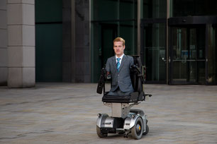 Janis McDavid im Rollstuhl vor dem Bürogebäude