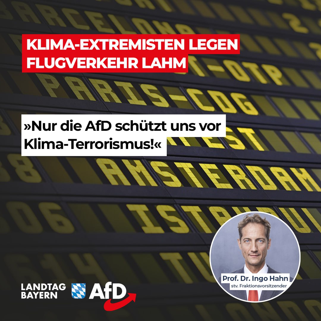 Zurück zu Ingo Hahn: Auch in Bayern: Klima-Extremisten legen Flugverkehr lahm – Nur die AfD schützt uns vor Klima-Terrorismus!