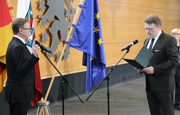 Thüringens neuer Ministerpräsident Bodo Ramelow wird von Landtagspräsident Christian Carius vereidigti Bild: Karl-Ludwig Poggemann, on Flickr CC BY-SA 2.0