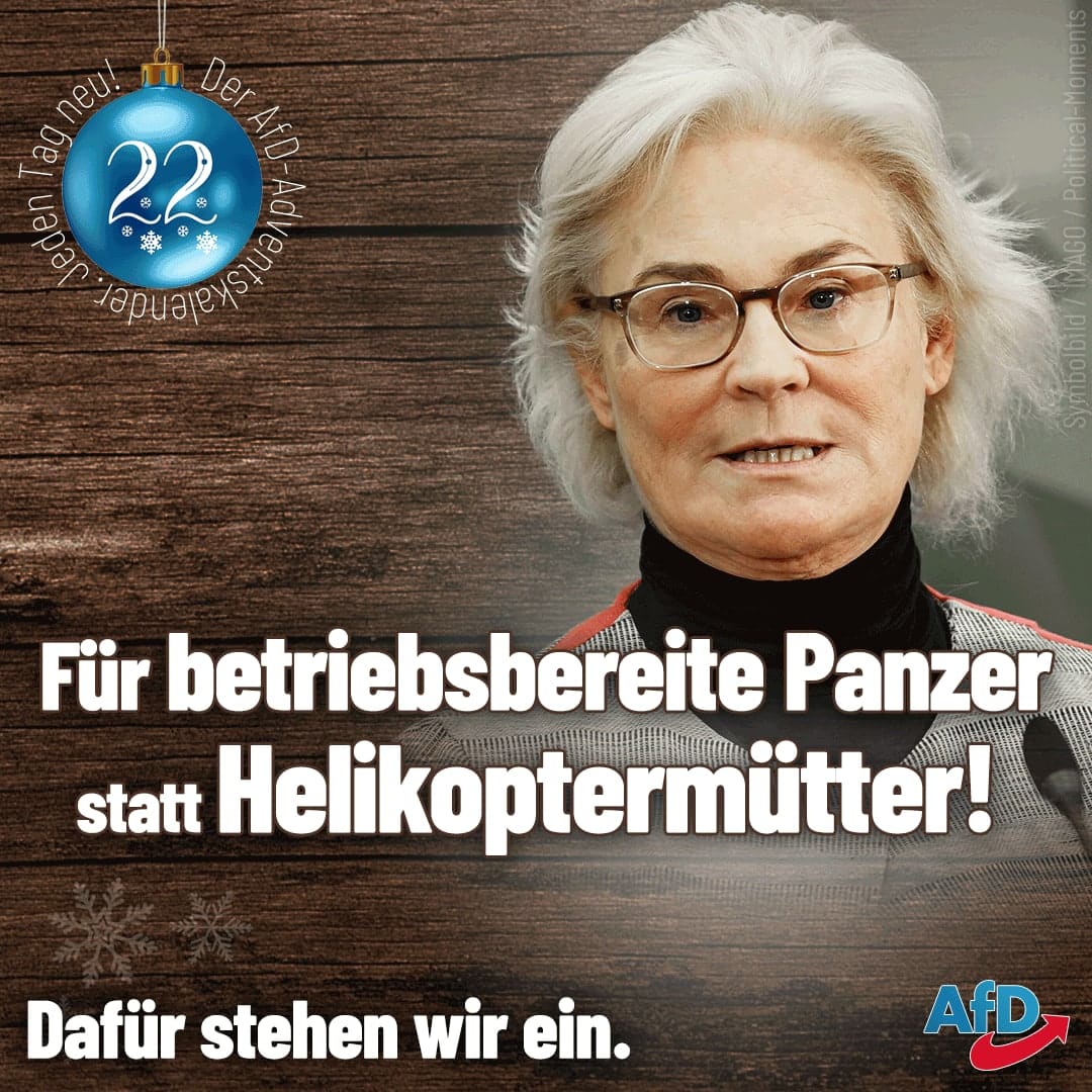 Zurück zu 21. Türchen im AfD-Adventskalender: Für betriebsbereite Panzer statt Helikopter-Mütter!