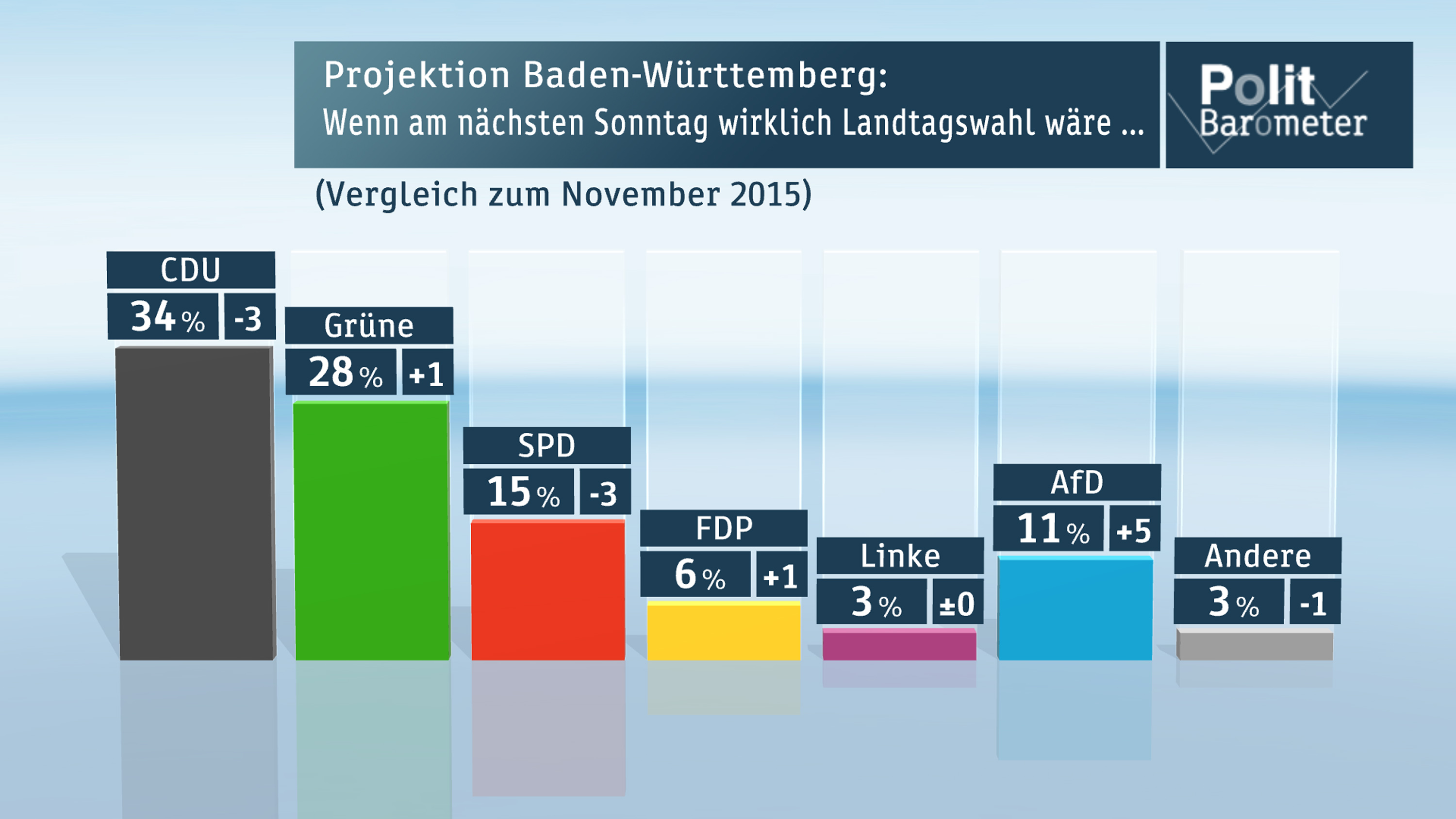 Zurück zu ZDF-Politbarometer Extra Baden-Württemberg Januar 2016: Vorsprung der CDU schrumpft - AfD zweistellig