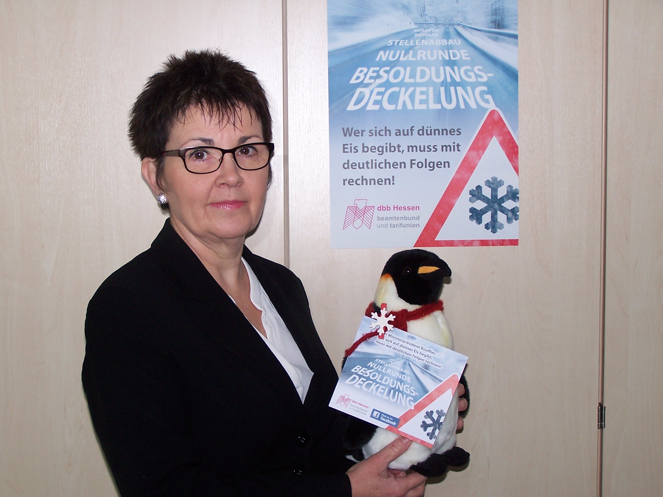Die dbb-Landesvorsitzende Ute Wiegand-Fleischhacker präsentiert Protest-Plakat und Eiszeitzeitpinguin. Bild: "obs/dbb Hessen beamtenbund und tarifunion/Thomas Müller"