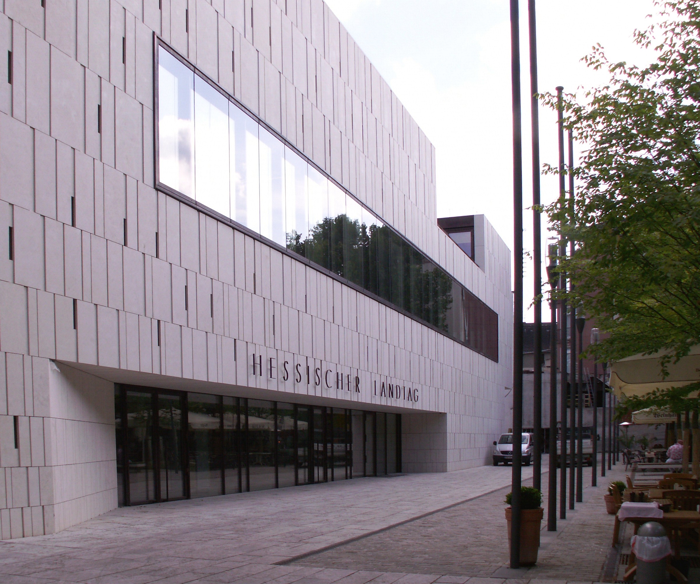Fassade des Hessischen Landtags in der Grabenstraße mit neuem Eingang nach langjährigem Umbau - architektonischer Kontrast auf der Rückseite des alten nassauischen Stadtschlosses in Wiesbaden (Ansicht Grabenstraße/Bäckerbrunnen)