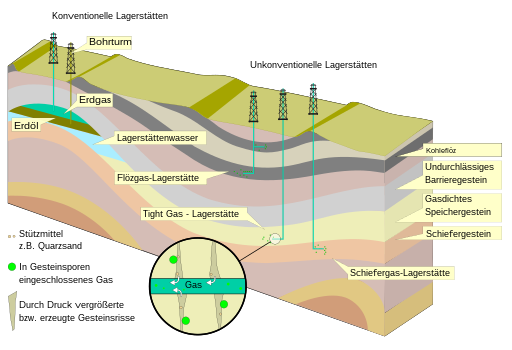 Schematische Darstellung der Förderung von Erdöl und Erdgas, links: konventionelle Lagerstätte (mit Erdöl assoziiertes Erdgas), rechts: unkonventionelle Lagerstätten.