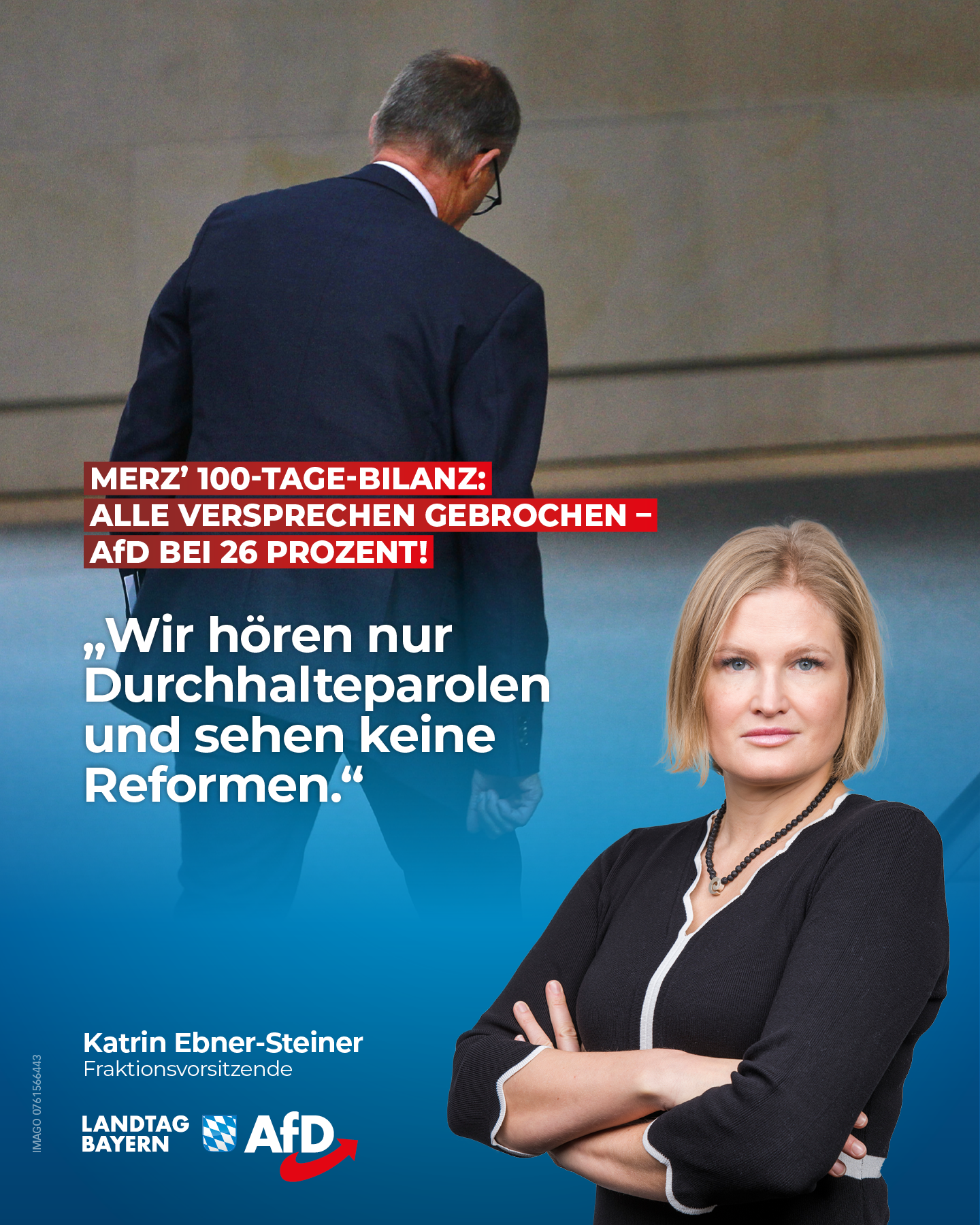 Zurück zu Katrin Ebner-Steiner: Merz’ 100-Tage-Bilanz: Alle Versprechen gebrochen – AfD bei 26 Prozent!
