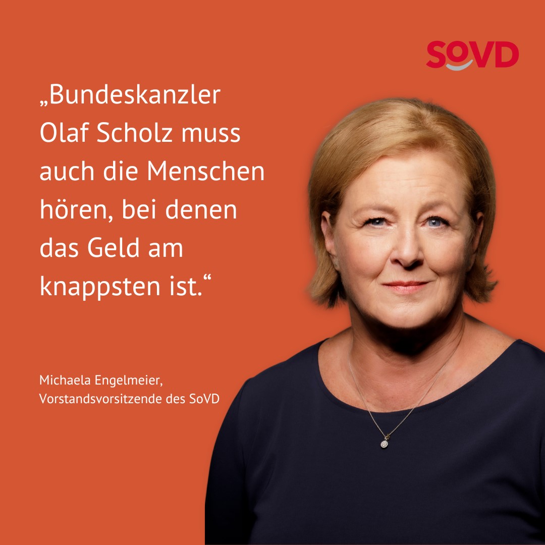 Zurück zu SoVD-Vorstandsvorsitzende Michaela Engelmeier: "Der Kanzler muss auch die Menschen hören, bei denen das Geld am knappsten ist."