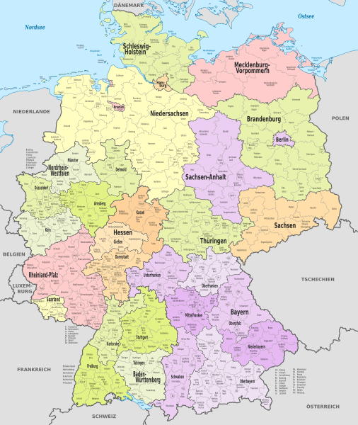 Politische Gliederung Deutschlands in Länder mit Regierungsbezirken, (Land-)Kreisen und kreisfreien Städten
