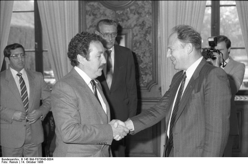 Minister Jürgen Warnke (r.) begrüßt 1986 den Präsidenten der Republik Guatemala, Marco Vinicio Cerezo Arévalo