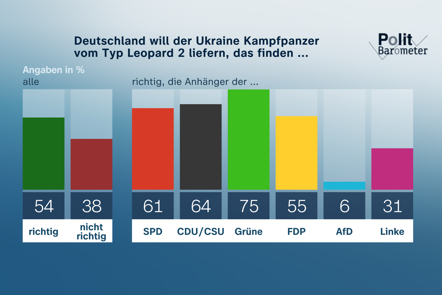 Zurück zu ZDF-Politbarometer Januar II 2023 Mehrheit für Lieferung von Leopard-2-Panzern an Ukraine Verhältnis der Ampelparteien eher schlecht, aber Koalition wird halten
