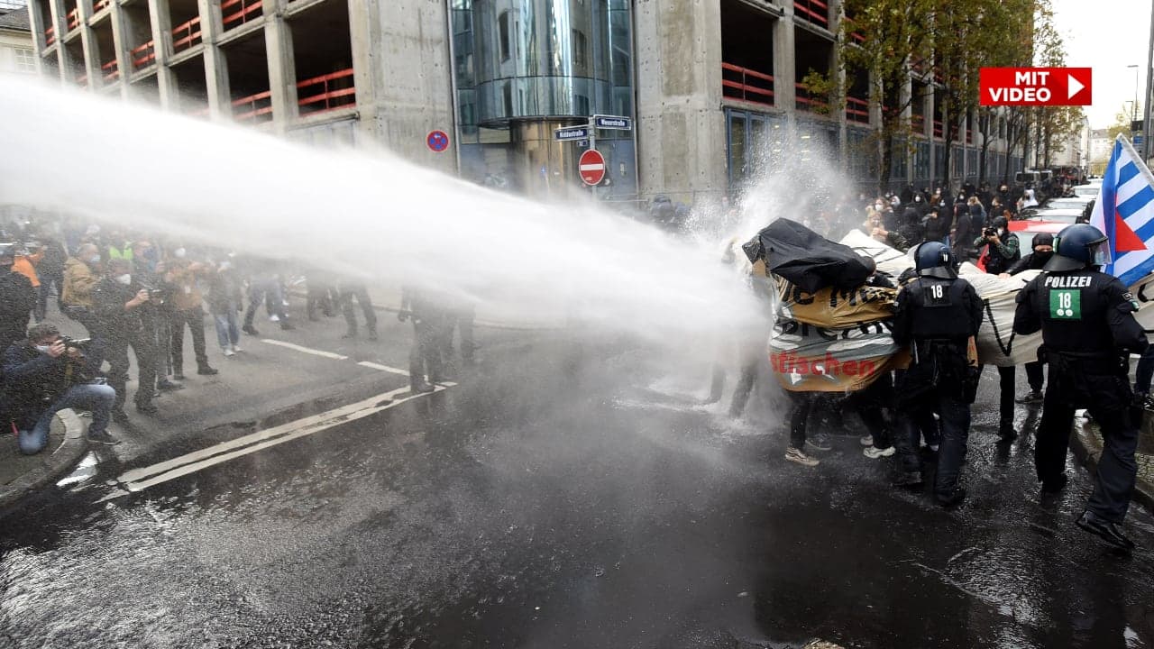 Ein Wasserwerfer wurde gegen friedliche Demonstranten in Frankrut eingesetzt.