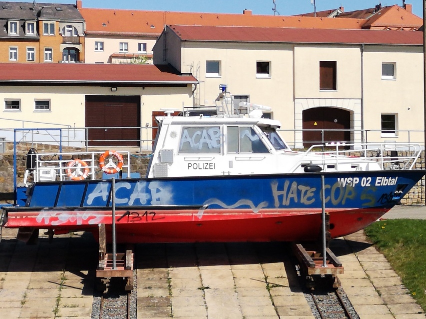 Unbekannte Täter beschmierten ein auf einem Trockendock auf einem Grundstück des Wasserstraßen- und Schifffahrtsamt Dresden in Pieschen liegendes Polizei-Boot mit Parolen wie 'ACAB' und 'Hate Cops'. Bild: "obs/AfD - Alternative für Deutschland"