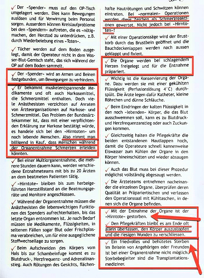 Organspende kann nur bei lebenden Menschen durchgeführt werden: Daher besteht die Pflicht zur Narkose des "Hirntoten" und Anschnallpflicht weil sich der "Hirntote" sonst wehrt...