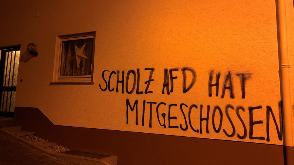 Haus des hessischen Abgeordneten Heiko Scholz mit Hassparole beschmiert – 5.000 Euro Schaden. AfD bundesweit mit Abstand am meisten von Hetz-Attacken bedroht.