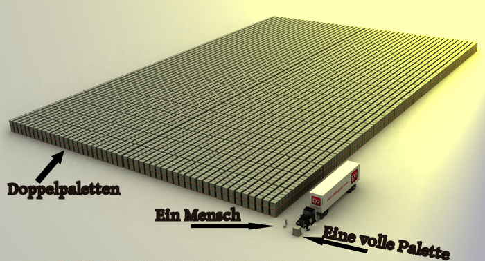 Größenvergleich: Das sind 1 Billion (=1.000 Milliarden) Euro in 100 Euro Scheinen. Zu sehen sind doppel Europaletten voll mit 100 Euro Scheinen.