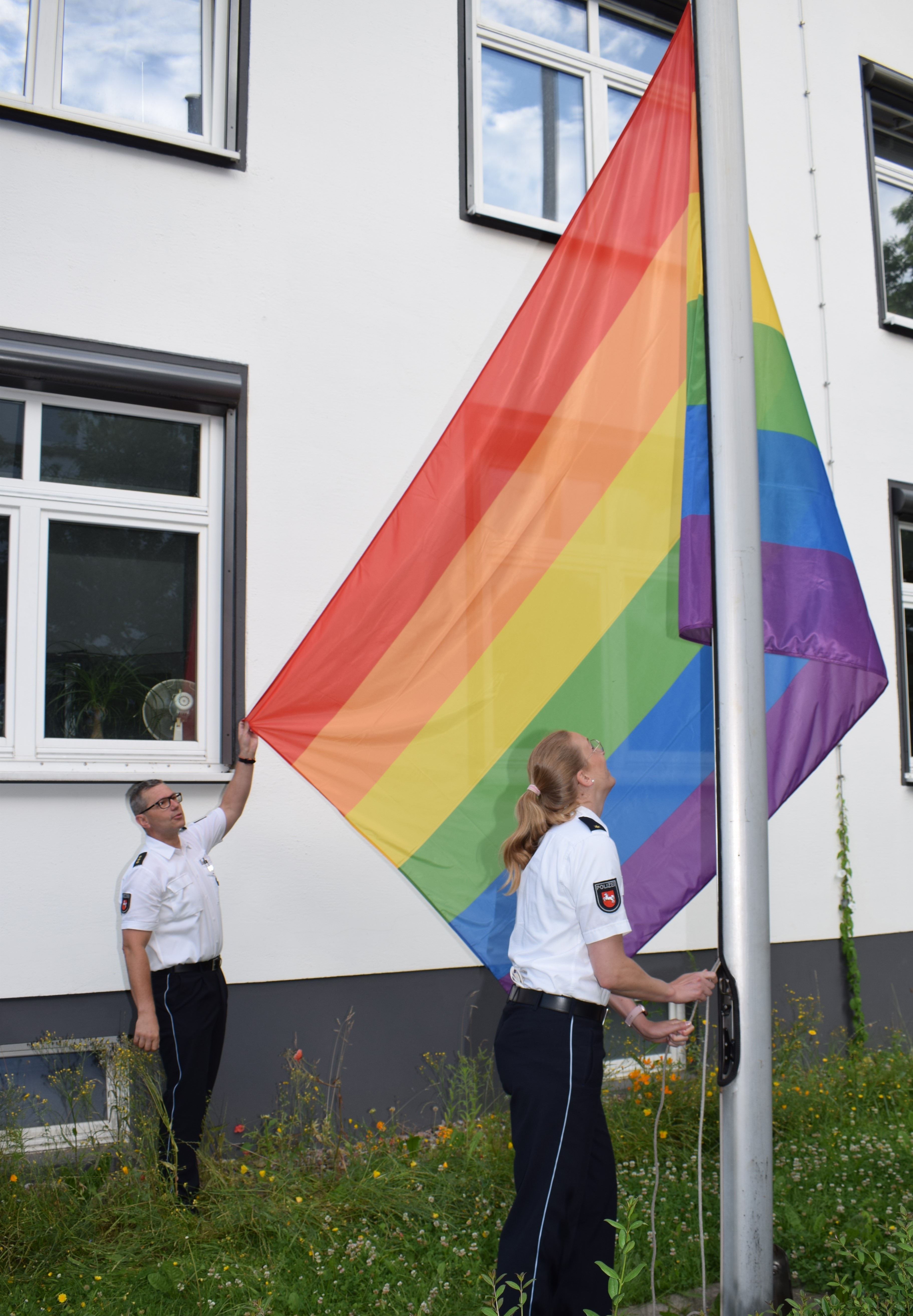 PD Kinzel und PR'in Vieth beim Hissen der Regenbogenfahne Bild: Polizei