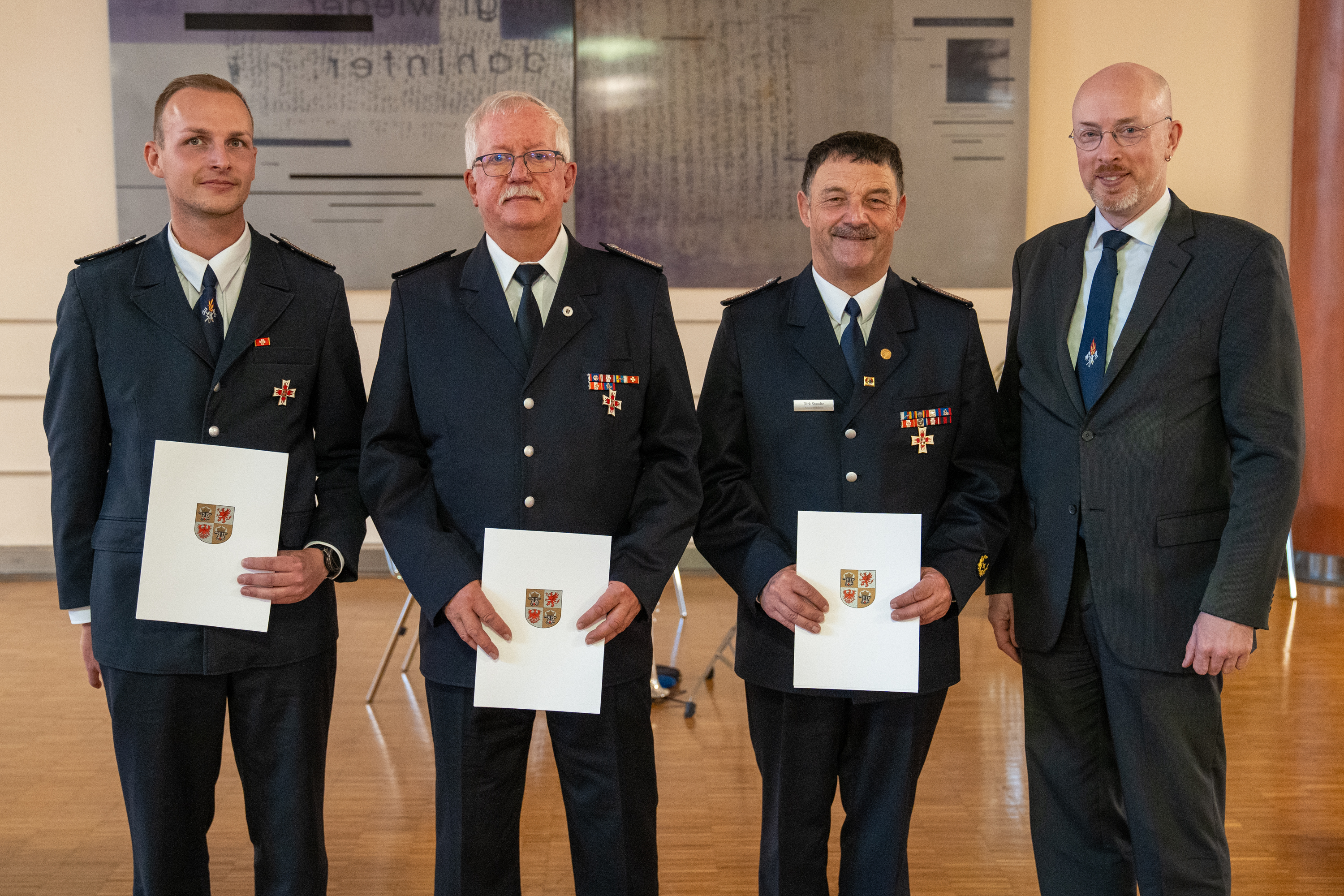 Innenminister Christian Pegel (r.) hat Brandmeister Michael Rühmling, Amtsbrandmeister Jürgen Gäth und Amtsbrandmeister Dirk Staudte (v.l.) (2024) Bild: IM