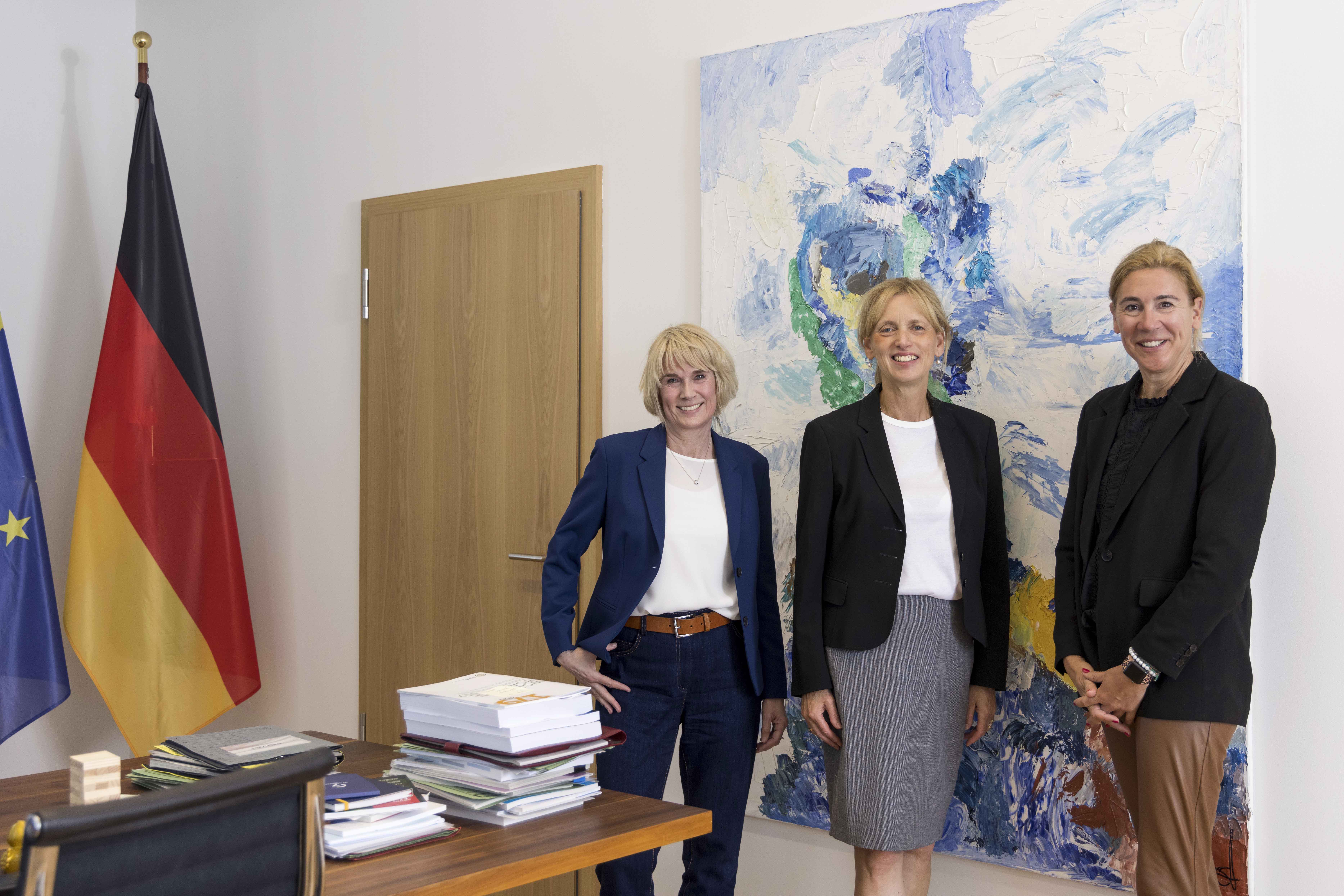 Karin Prien, Bundesministerin für Familie, Senioren, Frauen und Jugend (MITTE) mit BILD der FRAU-Chefredakteurin Sandra Immoor (links) und Alexandra Kemna, Ressortleitung Aktuelles (rechts) (2025) Bild: BILD der FRAU Fotograf: ANIKA BUESSEMEIER