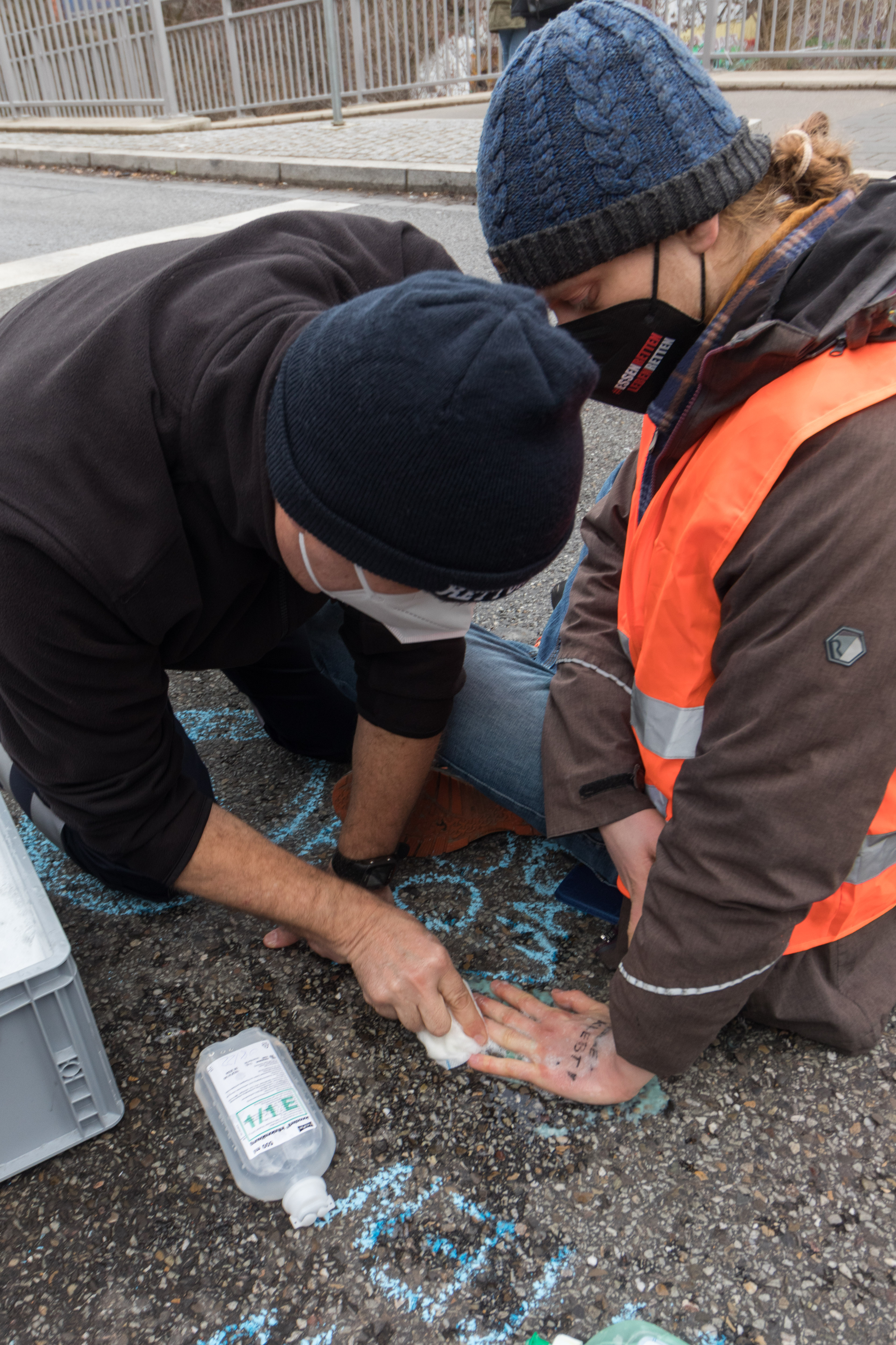 Ein Notarzt löst die Handfläche eines am Asphalt festgeklebten Aktivisten ...