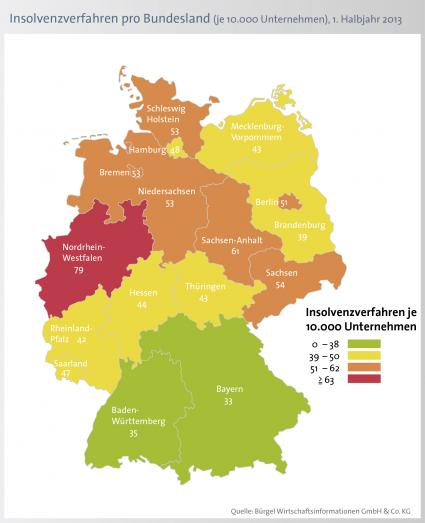Ein Großteil der Firmeninsolvenzen geht auf das Konto der Bundesländer Nordrhein-Westfalen (5.777), Bayern (1.751), Baden-Württemberg (1.240) und Niedersachsen (1.209). Aussagekräftiger ist indes der Blick auf die so genannte Insolvenzquote: den Anteil der Insolvenzen je 10.000 Unternehmen in einem Bundesland. Auch hier führt Nordrhein-Westfalen die Insolvenzstatistik mit 79 Firmeninsolvenzen je 10.000 Unternehmen an. Über dem Bundesdurchschnitt mit 49 Insolvenzen je 10.000 Unternehmen rangieren auch Sachsen-Anhalt (61), Sachsen (54), Schleswig-Holstein, Niedersachen und Bremen (jeweils 53) sowie Berlin (51).