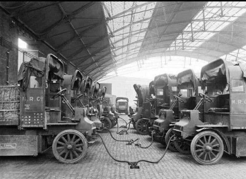 Elektroautos in ihren Ladestationen (ca. 1917)