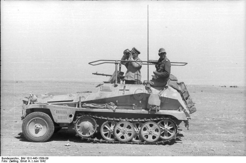 Rommel in seinem Befehlsfahrzeug „Greif“, Aufnahme der Propagandakompanie der Wehrmacht, Juni 1942.
