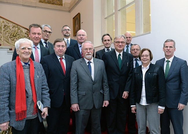 Gruppenfoto mit Mitgliedern des Parlamentarischen Kontrollgremiums und der Unabhängigen Historikerkommission zur Erforschung der Geschichte des Bundesnachrichtendienstes 1945 - 1968. Bild: Deutscher Bundestag / Achim Melde