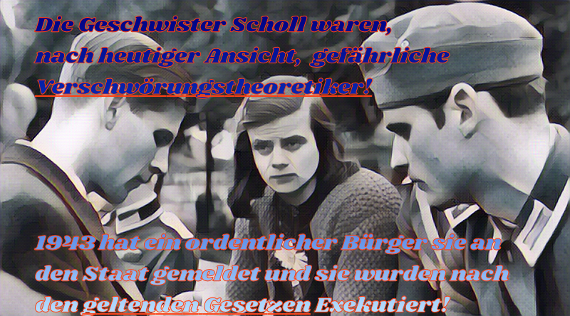 Übertragen auf die kruden Ansichten einiger Politiker und Bürgern, handelte es sich krass ausgedrückt bei den Geschwistern Scholl auch um gefährliche Verschwöhrungstheoretiker! Die 1943 von einem aufmerksamen Bürger an den Staat gemeldet und nach den geltenden Gestzen Exekutiert wurden. Vielleicht fällt an diesem "noch übertriebenen Beispiel auf, in welche gefährliche Richtung eine solch vermeintliche Denkweise führen kann ...