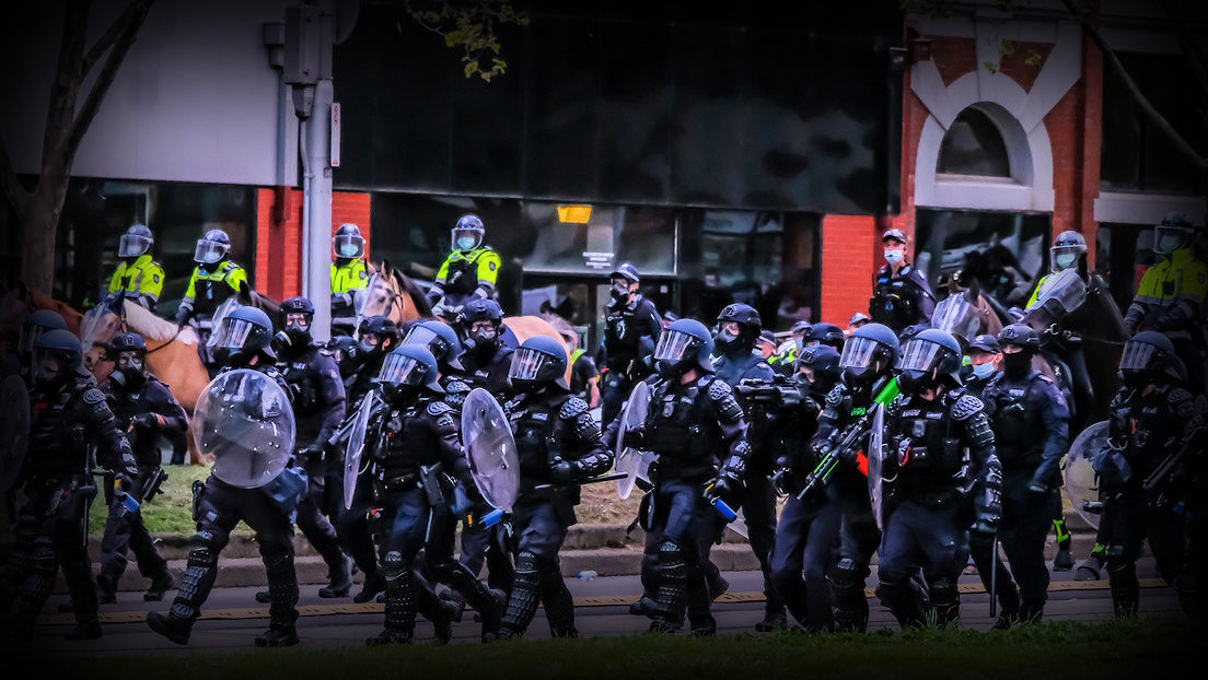 Polizeitruppen in Australien am 21.9.2021 mit Pfefferspray, Gummigeschossen, Schlagstöcken, Schilde und Blendgranaten gegen Demonstranten (Symbolbild)