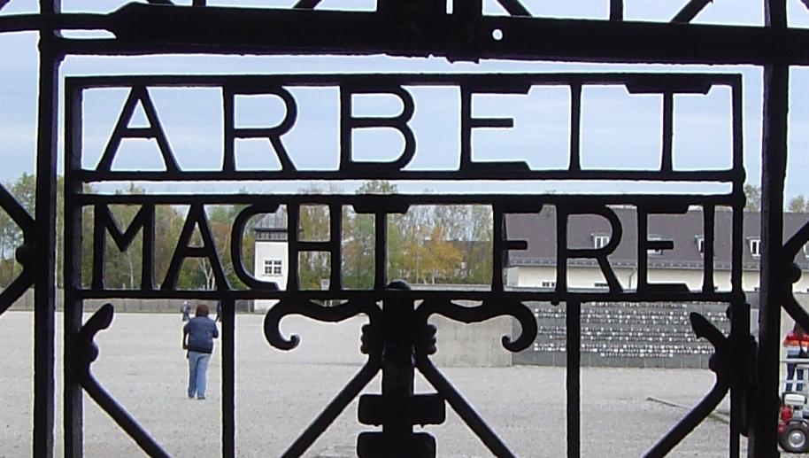 Tor im KZ Dachau mit Inschrift „Arbeit macht frei“