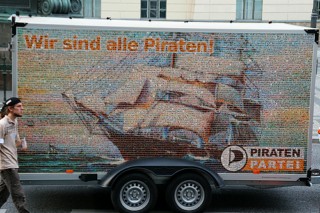 Die Rückseite des gläsernen Mobils mit dem "Ich bin Pirat!"-Riesenposter. Bild: Olaf Haensel