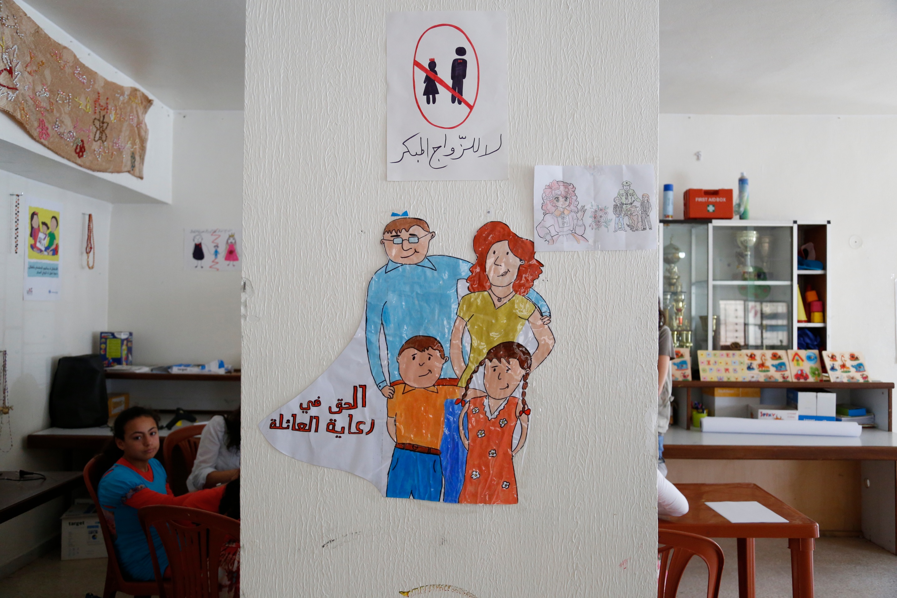 Drawings by young Syrian refugee girls in a community centre in southern Lebanon promote the prevention of child marriage.
