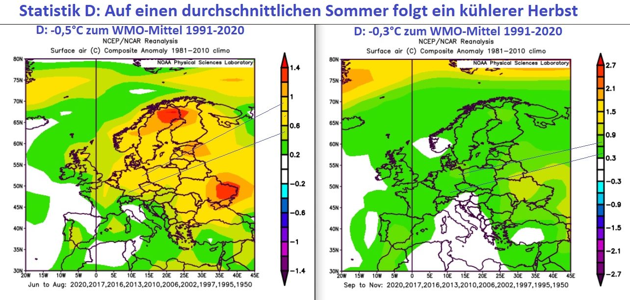 Die NOAA-Reanalyse zeigt nach einem durchschnittlich temperierten Sommer wie im Jahr 2021 (links) in den zehn Vergleichsjahren seit 1950 mit Mitteltemperaturen ebenfalls um 17,9°C (+- 0,3°C) einen noch etwas kühleren Herbst. Statistisch ist also 2021 in Deutschland ein noch etwas kühlerer Herbst zu erwarten, wie es der Sommer 2021 ausser im Juni überwiegend ebenfalls war. Bild: NOAA / WBDGE / Eigenes Werk