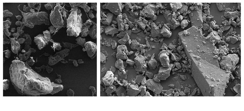 Mikroplastik aus Peeling-Produkten (li.) und gemahlenes Karnaubawachs (re.) haben ähnliche Eigenscha Quelle: Fraunhofer UMSICHT (idw)