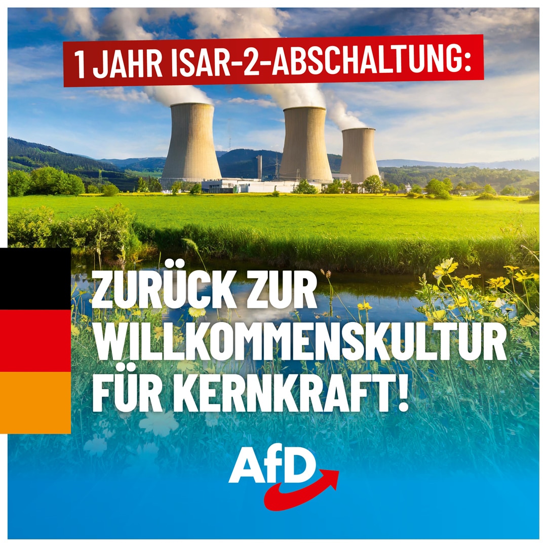 Zurück zu AfD: 1 Jahr Isar-2-Ausstieg: Zurück zur Willkommenskultur für Kernkraft!