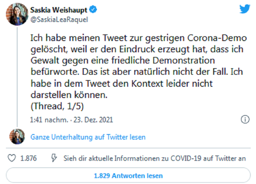 Zurück zu Grünen-Abgeordnete löscht wegen Aufruhr den Tweet: „Pfefferspray und Schlagstock“ gegen Querdenker